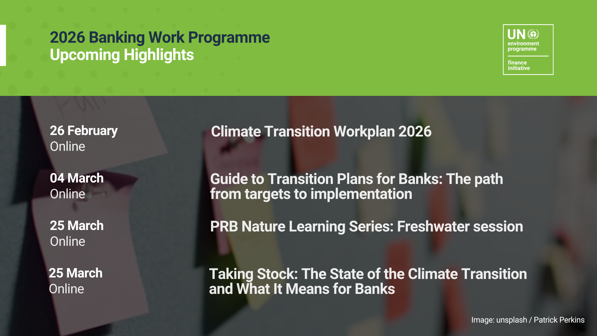 Watch the recording of the members’ webinar to hear from the UNEP FI team about the 2026 activities available to Principles for Responsible Banking signatories.