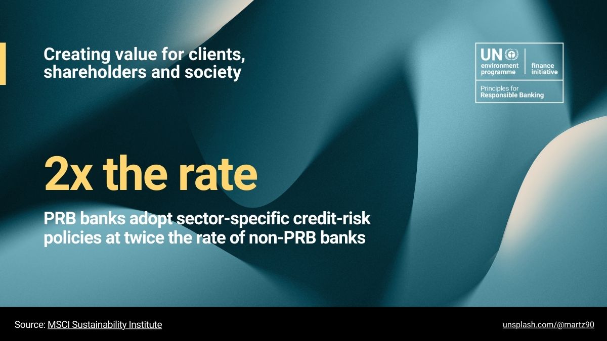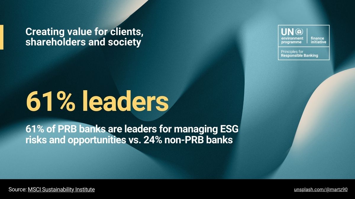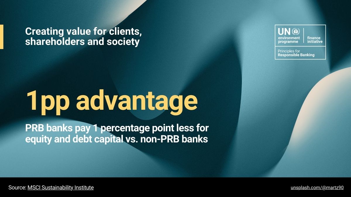 Spotlighting compelling, original research from MSCI, we note that 61% of PRB signatory banks are rated sustainability leaders vs. 24% of non-signatories. Moreover, the same study found that PRB signatories enjoy a lower cost of capital, averaging a 1 percentage point advantage over peers.