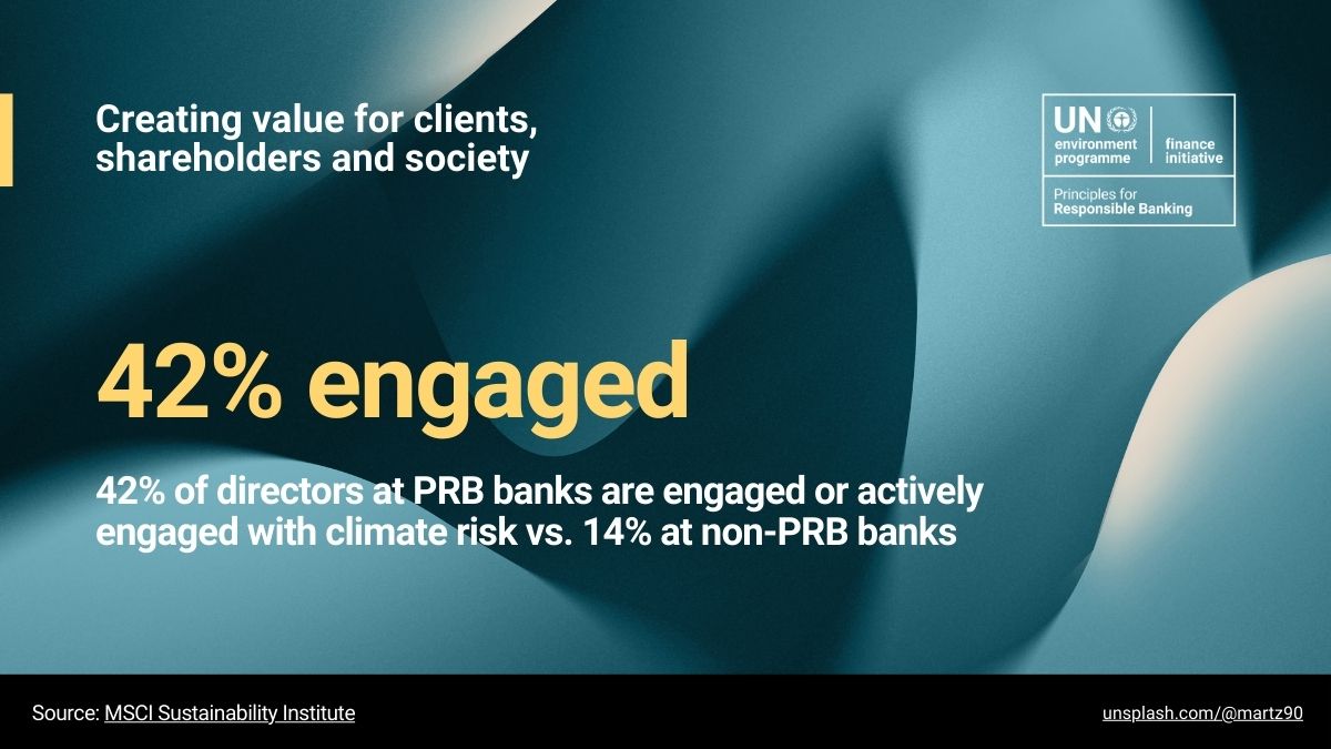 - Banks representing circa 50% of global banking assets embedding sustainability into strategy, governance and client relationships