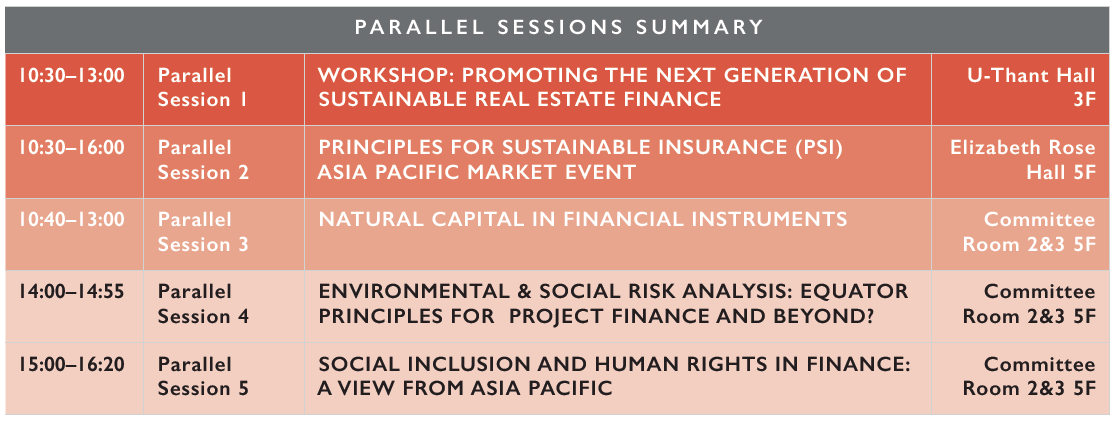 | 10:30-13:00 Elizabeth Rose Hall 5F | Parallel Session 2: Morning Sessions PRINCIPLES FOR SUSTAINABLE INSURANCE (PSI) ASIA PACIFIC MARKET EVENT |