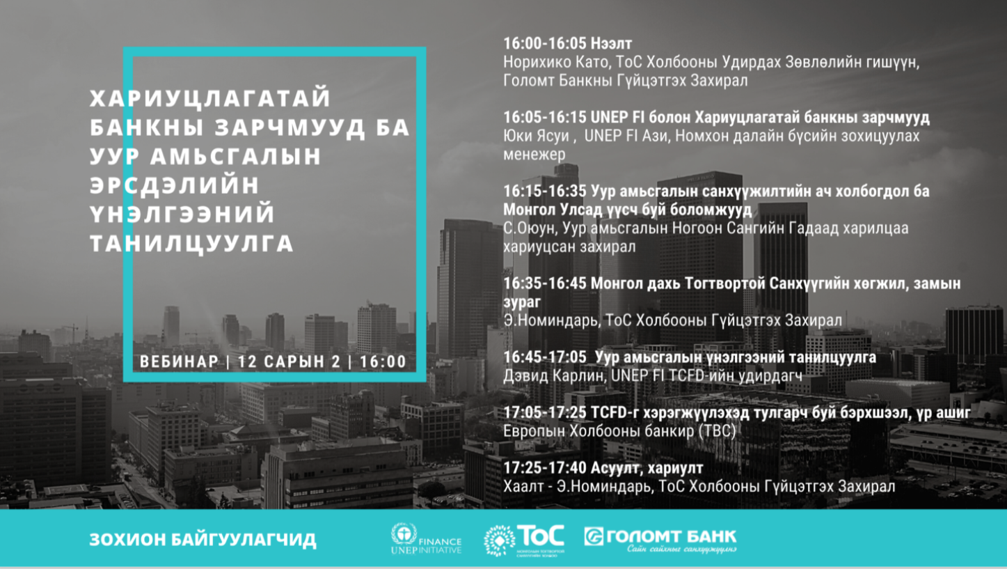 We are very pleased to be organising this webinar in partnership with the Mongolian Sustainable Finance Initiative, which has recently joined the UNEP Finance Initiative (UNEP FI) as a supporting institution and with the help of Golomt Bank. The content is specially tailored for the Mongolian finance community.