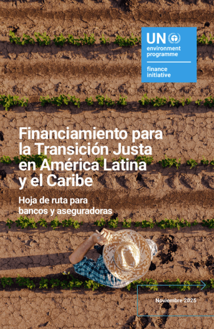 Financiamiento para la transición justa en América Latina y el Caribe: Hoja de ruta para bancos y aseguradoras – co-desarrollado con la International Labour Organization y elaborado en consulta con bancos, aseguradoras y actores clave, este informe proporciona un marco para integrar los principios de la transición justa en la gobernanza, el financiamiento, la gestión de riesgos y la participación de las partes interesadas de las instituciones financieras en América Latina y el Caribe.